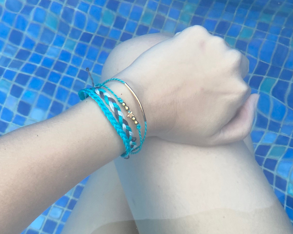 之前去蘇美島玩的時候,在沙灘上的小店買了幾條編織手環與腳環,玩水的時候覺得好酷好好看,但洗完澡也擦乾身體後,唯獨那棉線手環還是濕濕地,黏在身上很不舒服,且還會褪色,甚至臭臭,所以就漸漸被打人冷宮。