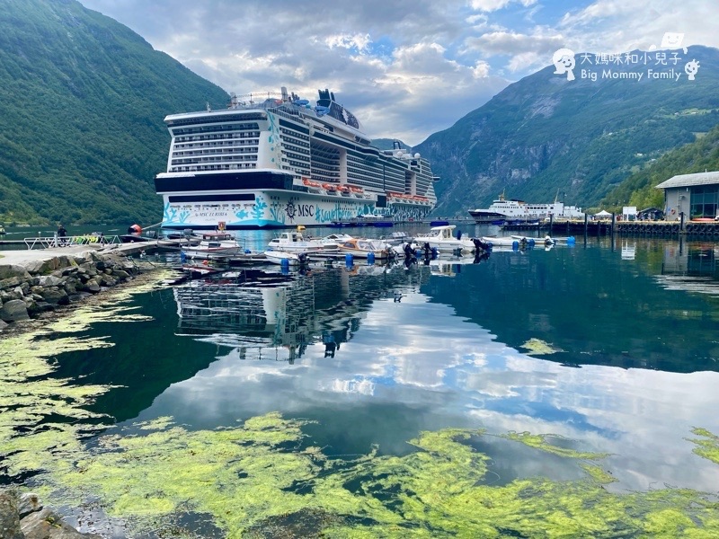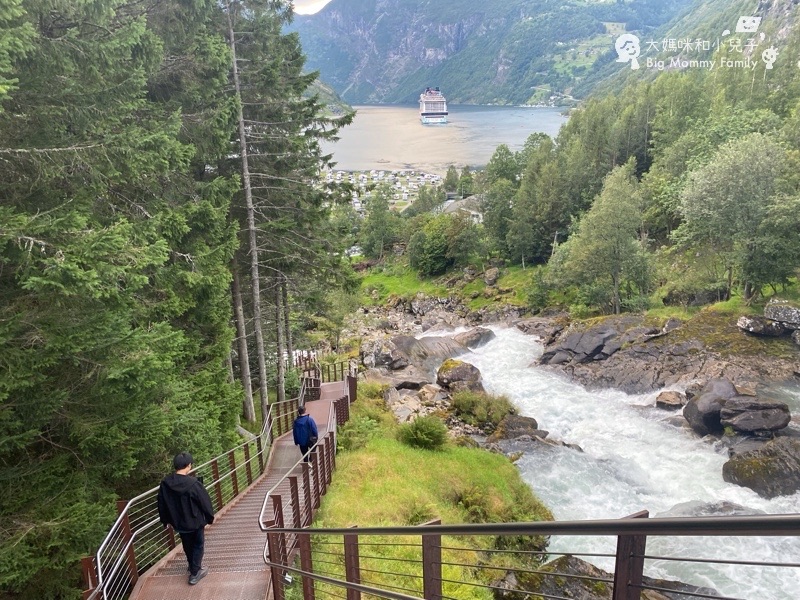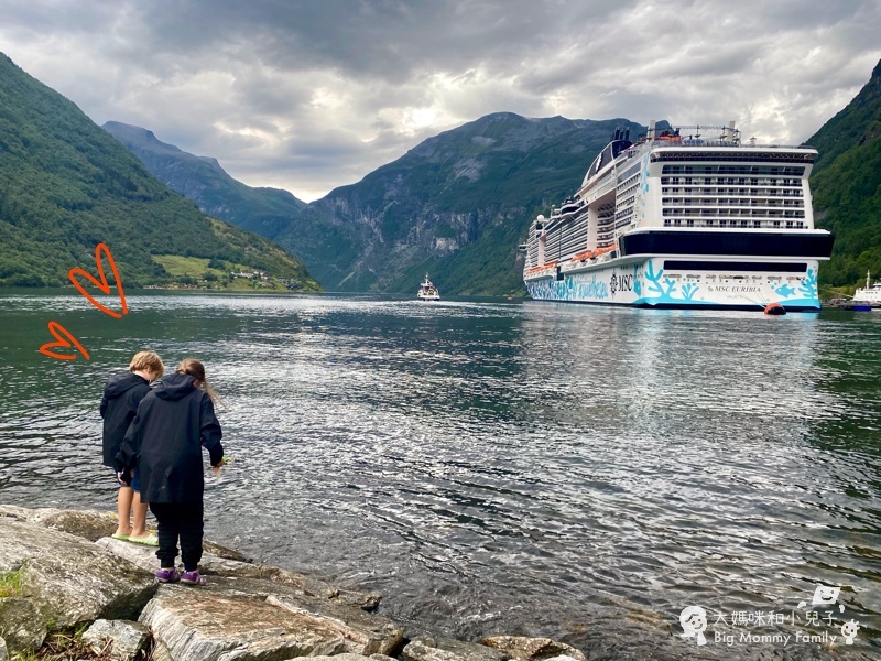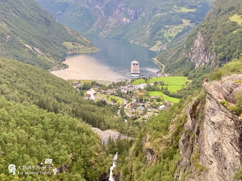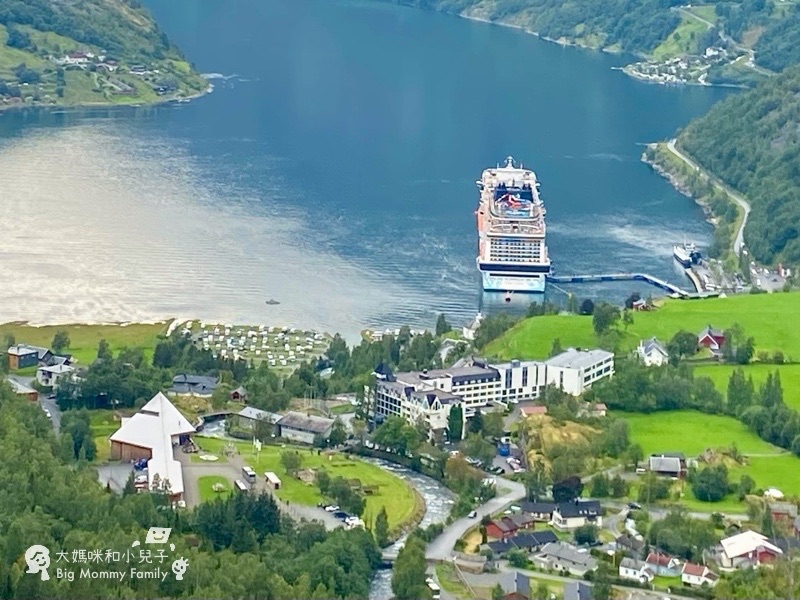 露營車大傢伙自然是沒辦法合法停好,所以為大的臭狗老公就在車上,讓老婆小孩很快跳下車看幾眼,挪威的峽灣景觀從高處眺望真的很美,加上蓋朗厄爾的巨大郵輪,即旁邊整齊排放的白白露營車,景觀確實獨特。