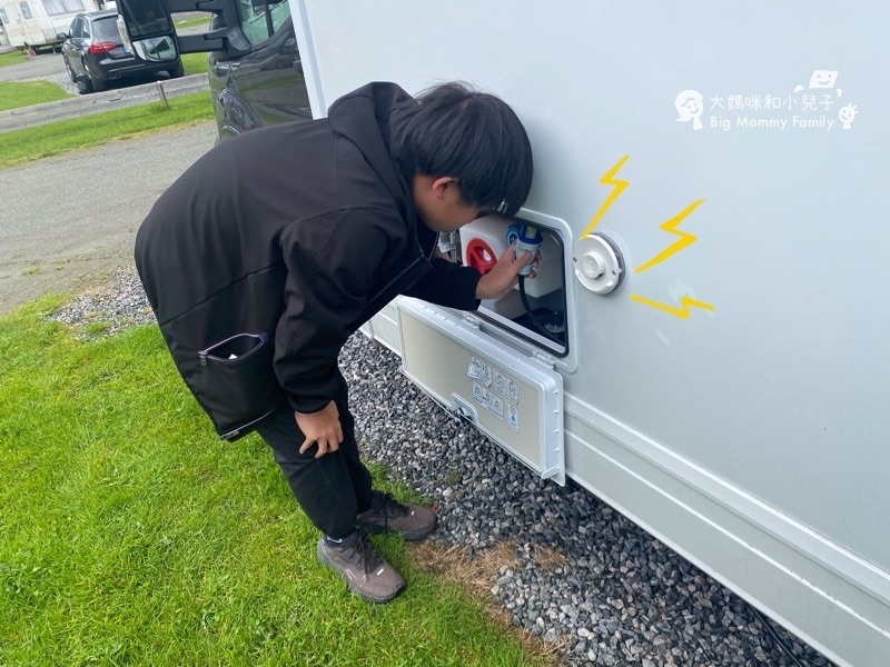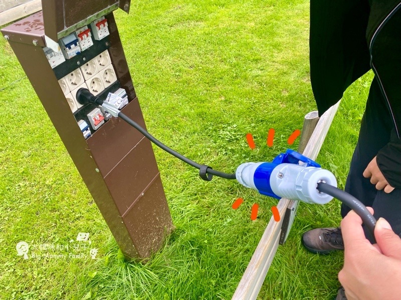 小人熟門熟路開始幫忙接水接電,大型停車場每一道邊緣都有充電樁,但這個營地或許為了因應各種需求,離我們比較近的那座,竟然只有兩孔,一路都是三孔,有點傻眼!