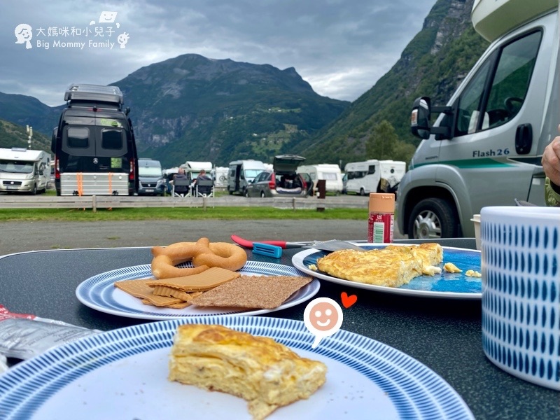 雖然像是住在停車場,但因為依山傍水,空氣新鮮,加上一起張羅餐點的樂趣,渡假感還是蠻有。(挪威魚糕多花點耐心煎得乾乾金黃會好吃許許許多)
