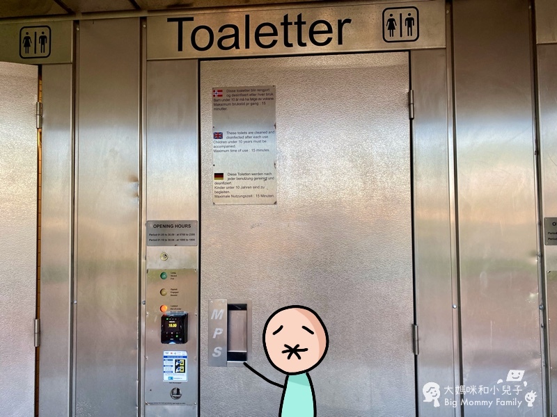 這麼多觀光客的公園竟然沒有免費公廁,雖然歐洲公廁多半要付費已經是常識,但才剛抵達還沒適應消費習慣,且以前都馬是去咖啡廳花2歐喝咖啡兼上廁所,看到15NOK約1塊多歐元,還是滿滿的不甘願,畢竟我們這一團有8個老小,能憋的只好盡量憋。