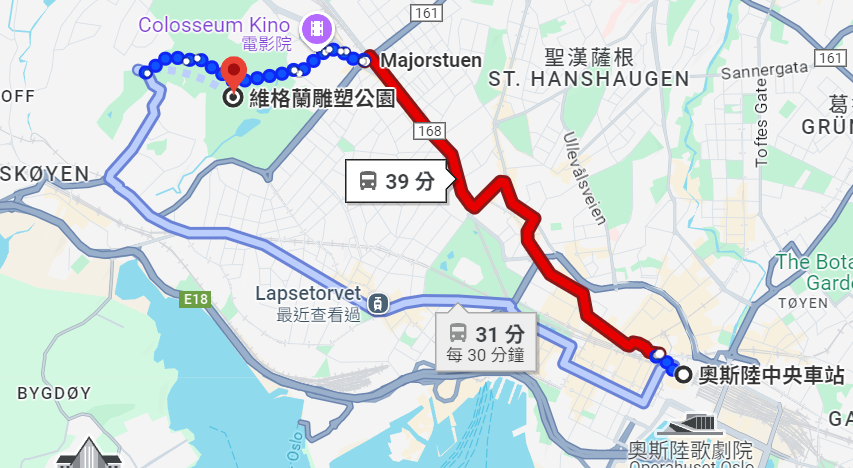 在台灣做功課的時候,目的地設Vigelandsparken維格蘭雕塑公園,總是會得到兩種路線圖,一種在北邊火車站,然後要走十幾分鐘,另一種在南邊,也是要走十幾分鐘,總交通時間都約莫40分鐘?大概是園區很大不能開車所以要走很久?
