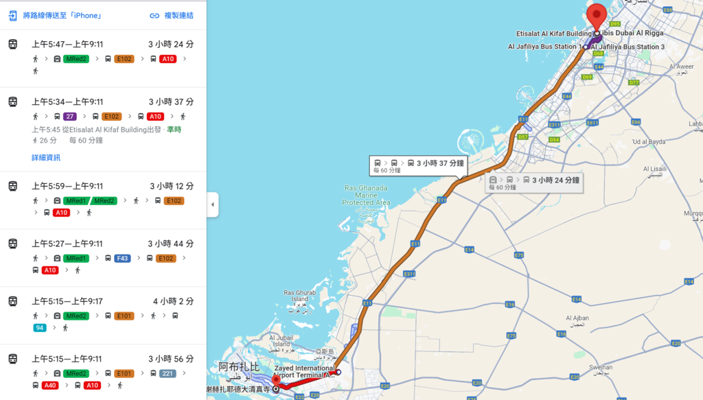 網路上大家都推薦搭乘E102巴士從杜拜到阿布達比,概念上有點像從台北到台中的客運,大約2小時,但還得加上從旅館到巴士站,及從巴士站到大清真寺的交通,Google Map顯示總時數是約3.5小時,來回豈不要吃掉7小時?