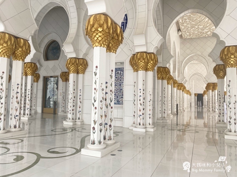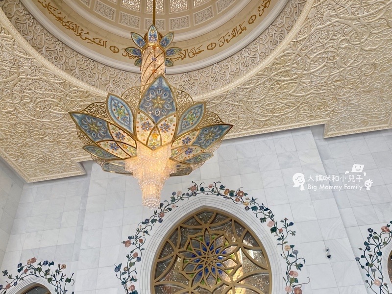 Sheikh Zayed Grand Mosque 大清真寺除了宏偉的雪白外觀,最著名的就是超級無敵豪華內裝,但實際參觀下來,覺得一點都不庸俗,精湛的手工藝令人嘖嘖稱奇,溫潤白色的大理石底、彩色的石材花兒、綠色系的超大地毯、很華麗(夠亮)但設計不誇張的水晶照明等,這些巨大的人工項目,融合得非常好,讓清真寺的內部非常溫柔細緻壯觀肅穆,不枉費我大費周章從台灣來啊!