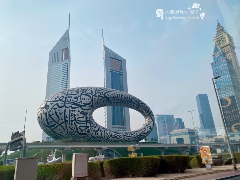 15人小巴士從北到南沿路去各個飯店接人,剛好可以見識一下那些我本來想定但覺得離機場太遠的中價位連鎖飯店(Hilton、Mövenpick 等),還可以看到幾個著名景點,例如杜拜相框及未來博物館等(看因高速公路不夠靠海所以看不到朱美拉棕梠島),杜拜厲害的建築物從各個角度看都有不同的感受,但因為太熱很難蒐集到很多,所以就等離開杜拜酋長國範圍之後再睡覺吧!