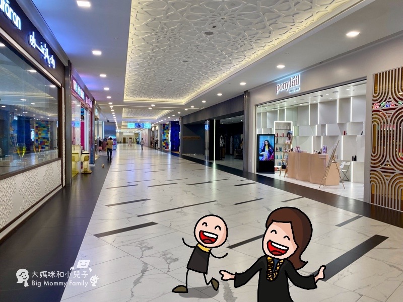 商店街?腦中浮現的是台灣風景區出口那種舊舊破破賣土產及小吃的景象,然後想像類似的畫面只是換成中東臉孔?錯了!無敵石油大王怎麼可能這麼庸俗,是一條像百貨公司的商店街及美食廣場,燈光美氣氛佳冷氣超涼,有幾間紀念品店及藝術品店可以逛逛(尤其逛完清真寺後就會腦波弱開買了)。