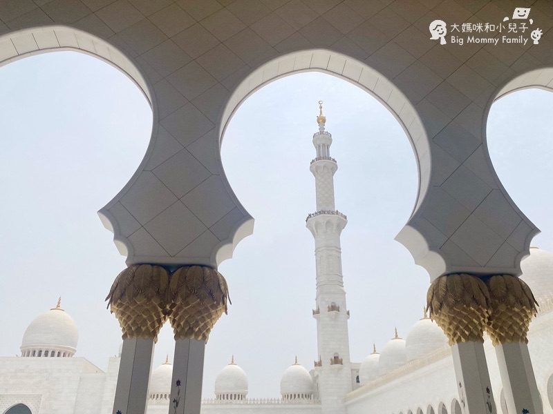 美中不足的是,之前跟計程車司機有聊到,為什麼天空總是濛濛的?原來這是杜拜八月的氣候特徵,似乎是因為高溫導致水氣濃厚?總之在八月份要看到乾淨的大藍天是不容易的,嗚嗚~大清真寺背景就要是藍天才威啊!殘念!