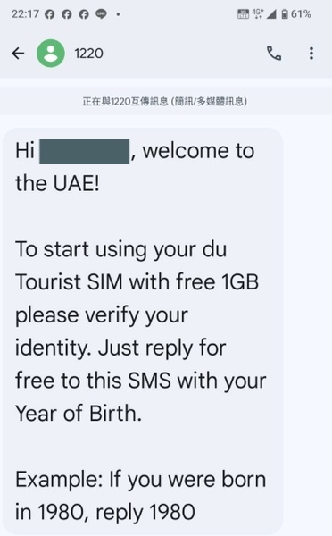 安裝的方式也非常簡單,頂針裡面也有隨附,插進手機後就會收到一封簡訊,果然是如網路上講的,你的名字(個資)就出現了,回傳你的出生年份到指示的號碼,即可完成開通,得到免費的1GB流量,有效期是24小時。