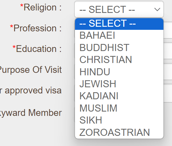 還有一個必填區是要寫宗教信仰,居然沒有「無」這個選項,依序是:BAHAEI巴哈伊教、BUDDHIST佛教、CHRISTIAN基督教、HINDU印度教、JEWISH猶太教、KADIANI與伊斯蘭教有關、MUSLIM穆斯林(伊斯蘭教)、SIKH錫克教、ZOROASTRIAN 祆 「ㄒㄧㄢ 」教。