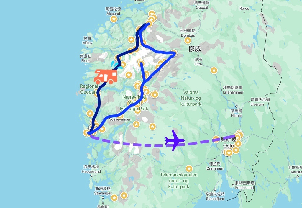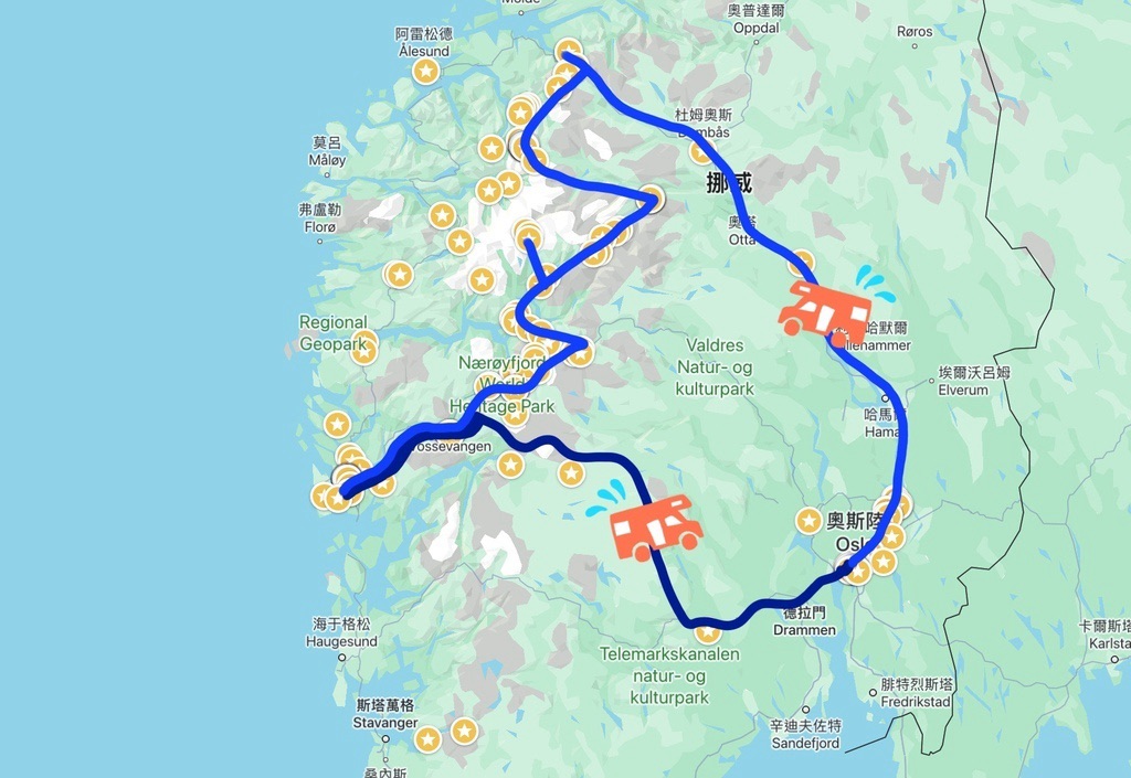 挪威露營車價格比別的國家高不少,2024年暑假一天將近一萬六!且甲租乙還要雙倍價,所以在哪裡租就要在哪裡還,一般直覺會直接從奧斯陸取車,想當然爾就要繞一圈回到奧斯陸還車,但行程排著排著就發現,這一大圈好遠哪!