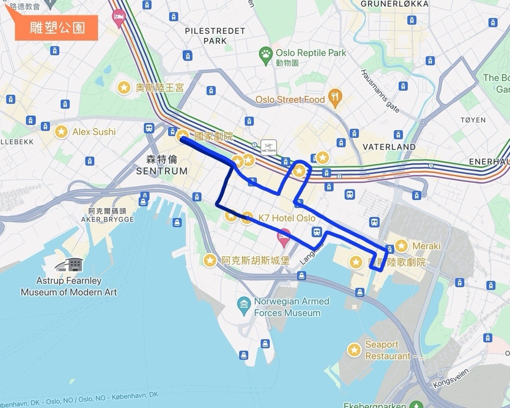 行程摘要是:奧斯陸機場入境-K7 Hotel-奧斯陸歌劇院-孟克美術館(不入內)-奧斯陸主教堂-卡爾約翰斯大道逛街-國家歌劇院與王宮(不入內)。