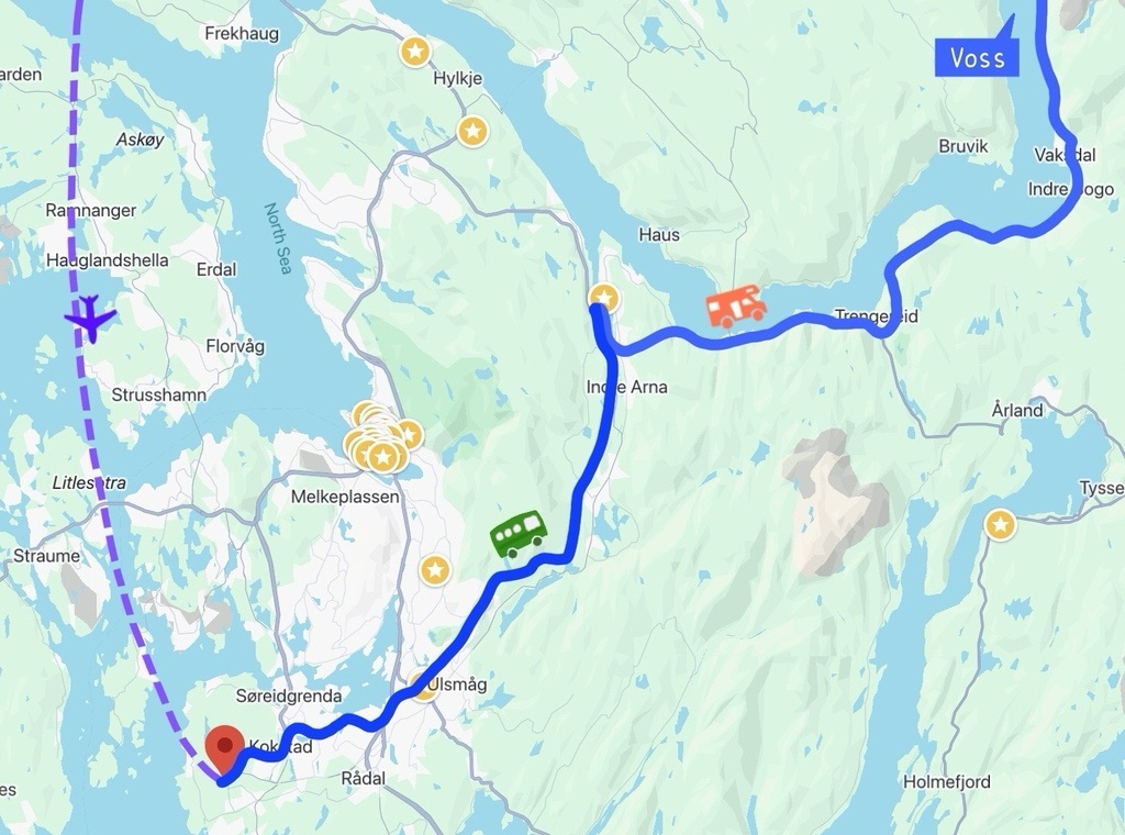 奧斯陸、卑爾根、特隆赫姆、斯塔萬格、特羅姆瑟這幾個大城市都有租車據點,但後面三個城市已經被刪除了,且更遠,開車更不合理,於是機會只剩下卑爾根。