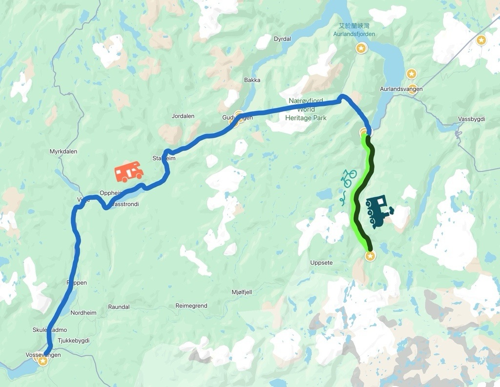 那柔伊峽灣的兩個著名小鎮Gudvangen古德凡根及Flam弗洛姆,有些YT覺得前者比較清幽好住,後者是挪威縮影的重點所以比較吵雜,但因為念念不忘高山火車瀑布紅衣女郎,及想嘗試騎腳踏車回Flam的活動,所以決定拚了,在這天塞滿行程!