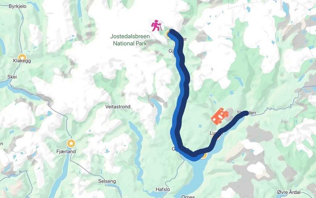 超過350公里的路程,大概就台北到高雄的距離,但在挪威,開起來比想像中「不」輕鬆許多,有些地方會因為峽灣得等搭渡輪,有些地方實在太漂亮了想停留一下,還有就是笨重的露營車本來就是要慢慢開,加上還要時不時讓臭狗司機休息,所以12:30下船後開到晚上9:00才到營地。