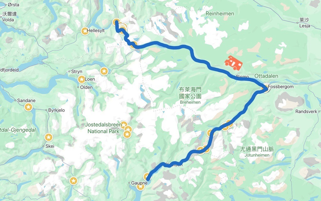行程摘要是:Fv55雪之路-Dale kyrkje白教堂-Sognefjell Road 1400m-Lom-Lom stavkyrkje-Geiranger-Storfossen瀑布步道-Geiranger Camping營地。