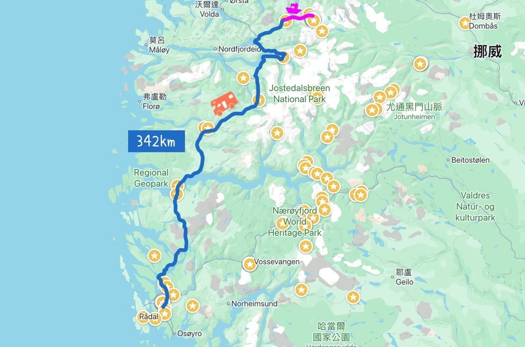 行程摘要是:老鷹之路Ørnesvingen Viewpoint-連人帶車搭渡輪從Geiranger到Hellesylt-Bergen Camping Park營地。