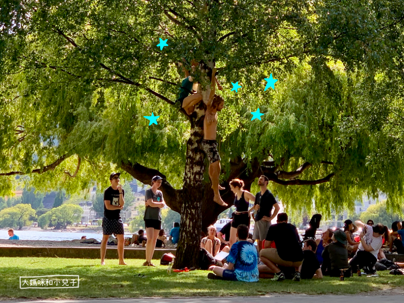 我們決定走5分鐘回飯店旁邊的的湖畔草皮野餐,心情又更沉澱了下來,老外就很懂得用各種方式在Wakatipu瓦卡蒂普湖旁遊樂放鬆,日光浴、瑜珈、爬樹、唱歌等,