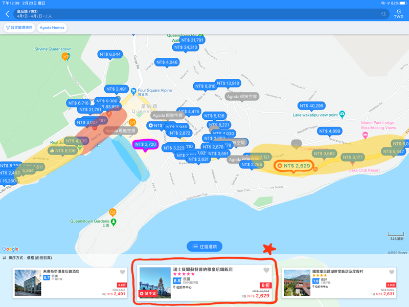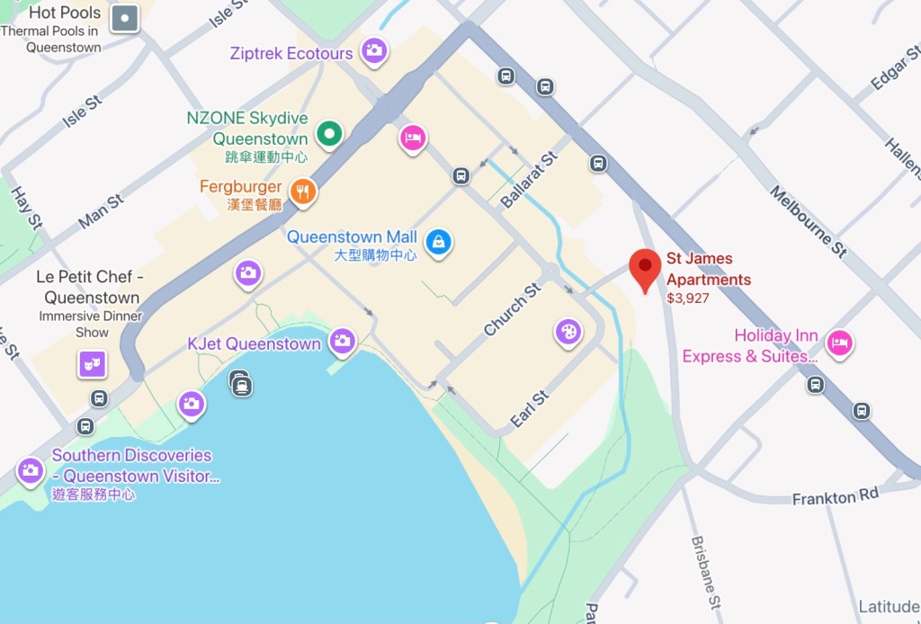 皇后鎮最好逛的地方,是上圖中紅色的部分,藍色的部分則是玩沙玩水的好地方,我第一天訂的NOVOTEL就是用桃紅色框起來的3,720位置,往北可以逛街,往南可以散步,很棒!多花一點錢還能住到湖景房。