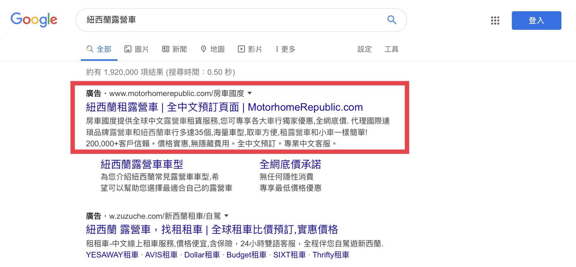 首先就是要找訂車網站,在Google搜尋「紐西蘭露營車」,自然會跑出很多選項,通常Motorhome Republic房車國度會出現在第一位,果然是國際化的租車平台,但難免會想比較一下其他的,就得用英文搜尋「New Zealand Motorhome」之類的關鍵字。