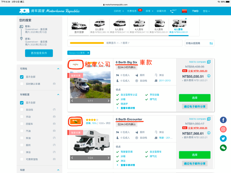 在[紐西蘭南島露營車] 要租露營車好還是自駕好還是Jucy? 中分享過選定旅遊模式的心路歷程,所以在逛網站的時候,基本上就是鎖定6人份的露營車款式,然後又在吸收完所有選擇後,開始比價。