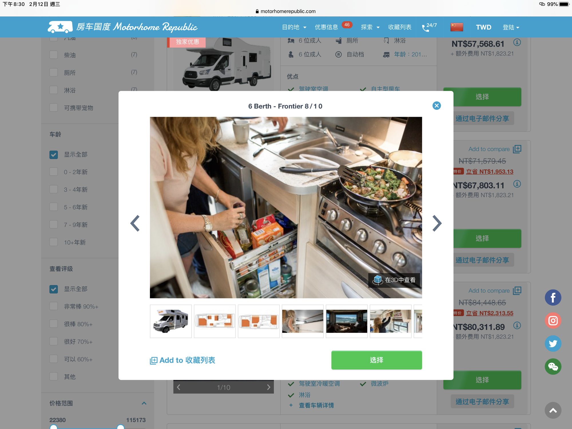首先開啟 Motorhome Republic房車國度( 中文版連結),雖然殘念只有是簡體版,但還是比較容易看懂這些陌生的露營車商品細節。