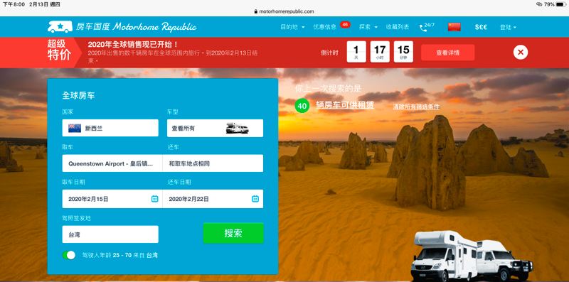 有整合多家來源的聯合平台,也有單一廠商的官網,對一切都還很陌生的行前準備期,決定開啟介面比較漂亮又清楚的Motorhome Republic房車國度,先摸索一下紐西蘭的廠牌與車款,最重要的是這裡有中文版。