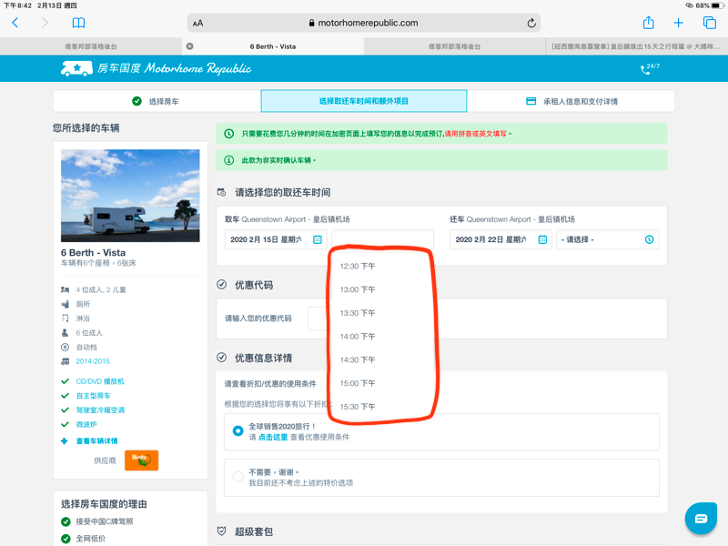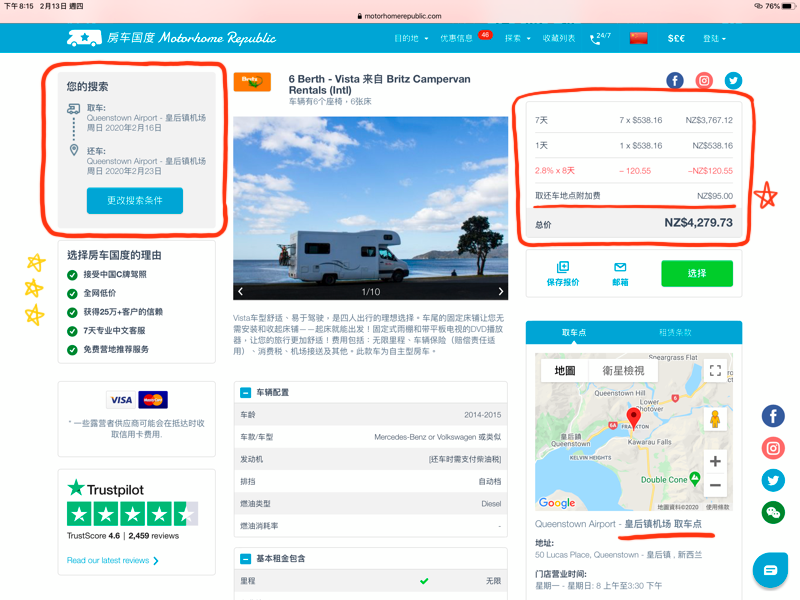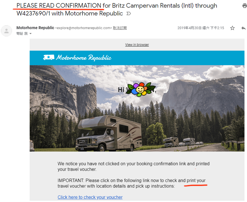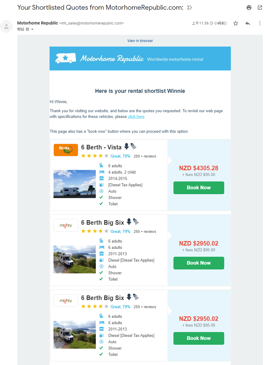 Motorhome Republic 幾乎是比下來最便宜的訂車網站,太好啦~這樣我就不用去承受那些我覺得不好用的網站(對~代表我幾乎都看完一輪了),就開始訂車。