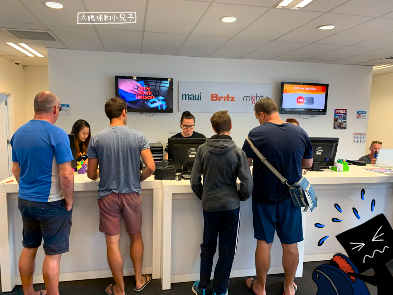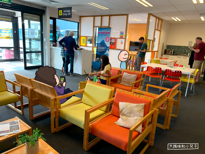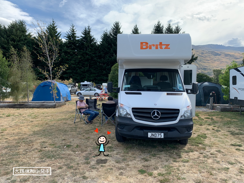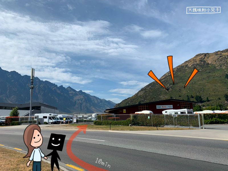 3大1小的行李其實真不少,我們先用肌肉皮卡把阿嬤跟小人及行李放在Britz露營車公司,夫婦倆把車開去皇后鎮機場還掉,然後走路回去,大約10分鐘的距離,租車公司也只會微笑鼓勵你,並沒有接駁的服務。(後來發現其實有!請再看下去)