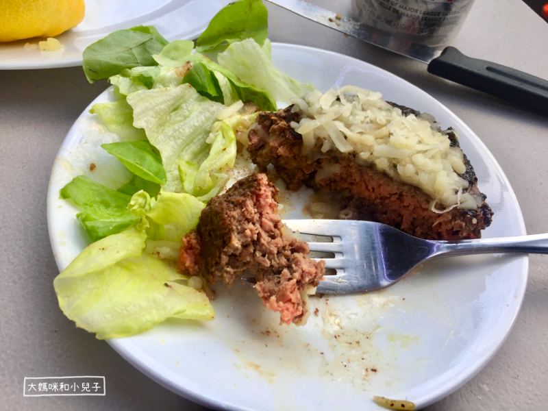 牛排、牛肉漢堡、牛排、豬排、牛排…,抹了鹽和胡椒又煎得香香的肉排,放在新鮮的生菜上,不習慣吃生菜的孩子也會加減呼嚕呼嚕吃下去,再搭配點起司、炒蘑菇等,營養簡單又只需要洗幾個盤子就好。