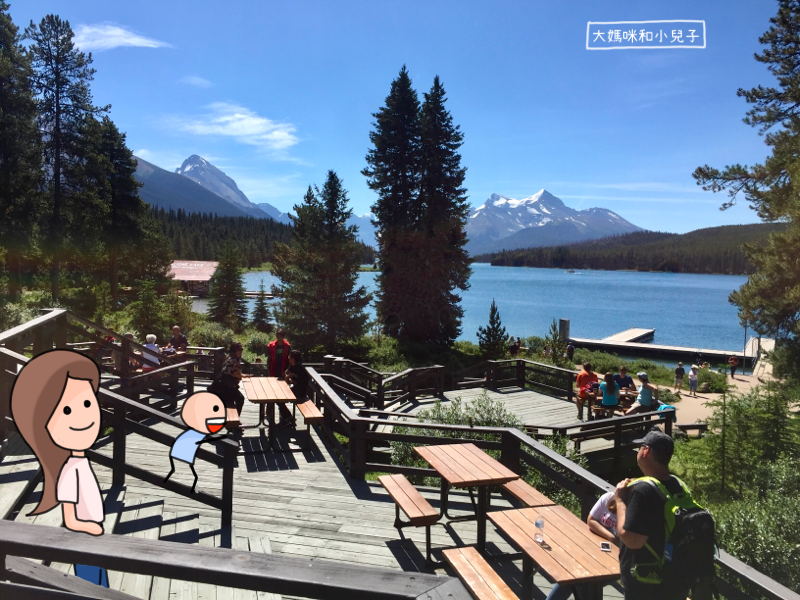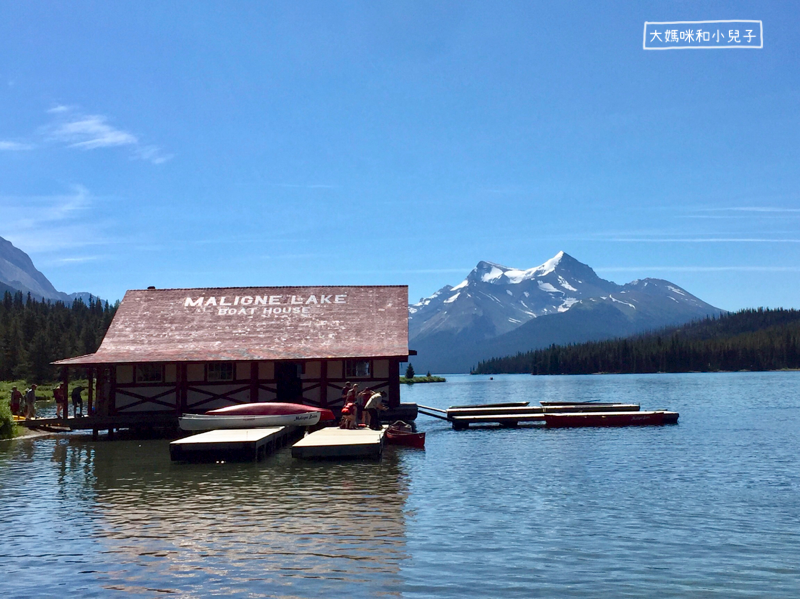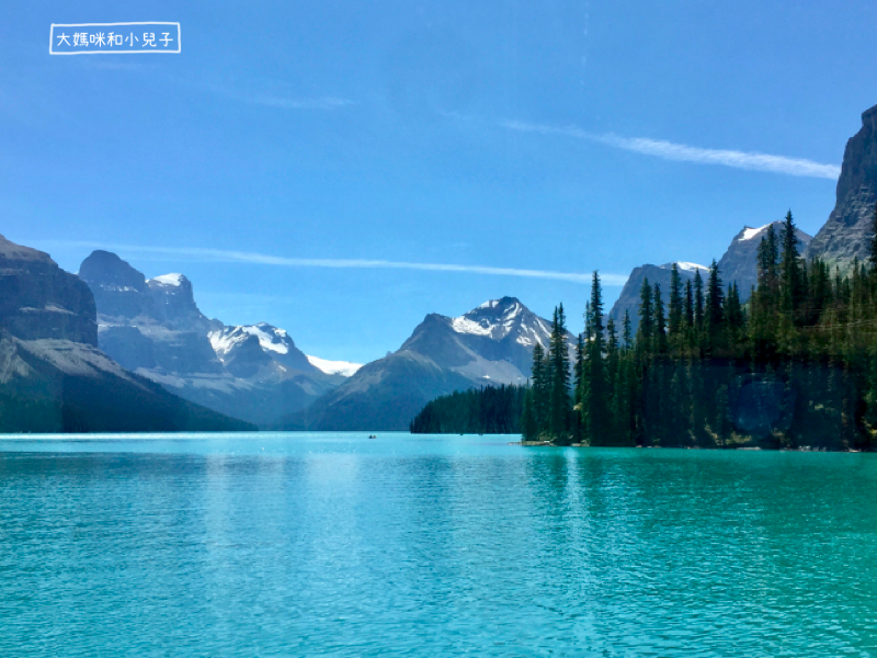 也是很狹長的 Maligne Lake 馬琳湖,背景的一座座白頭雪山,加上藍天白雲,這個開闊潔淨的美麗,讓人就想大口大口呼吸,喀擦喀擦拍照。