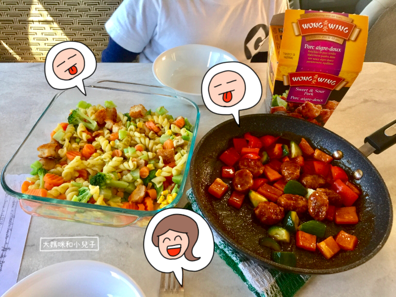 玩了一個上午,回到車上,廚娘已經越來越懂得利用微波食品,59分的冷凍義大利麵 + 61分的冷凍糖醋排骨拌炒新鮮蔬菜,加起來就是120分的即食午餐囉!