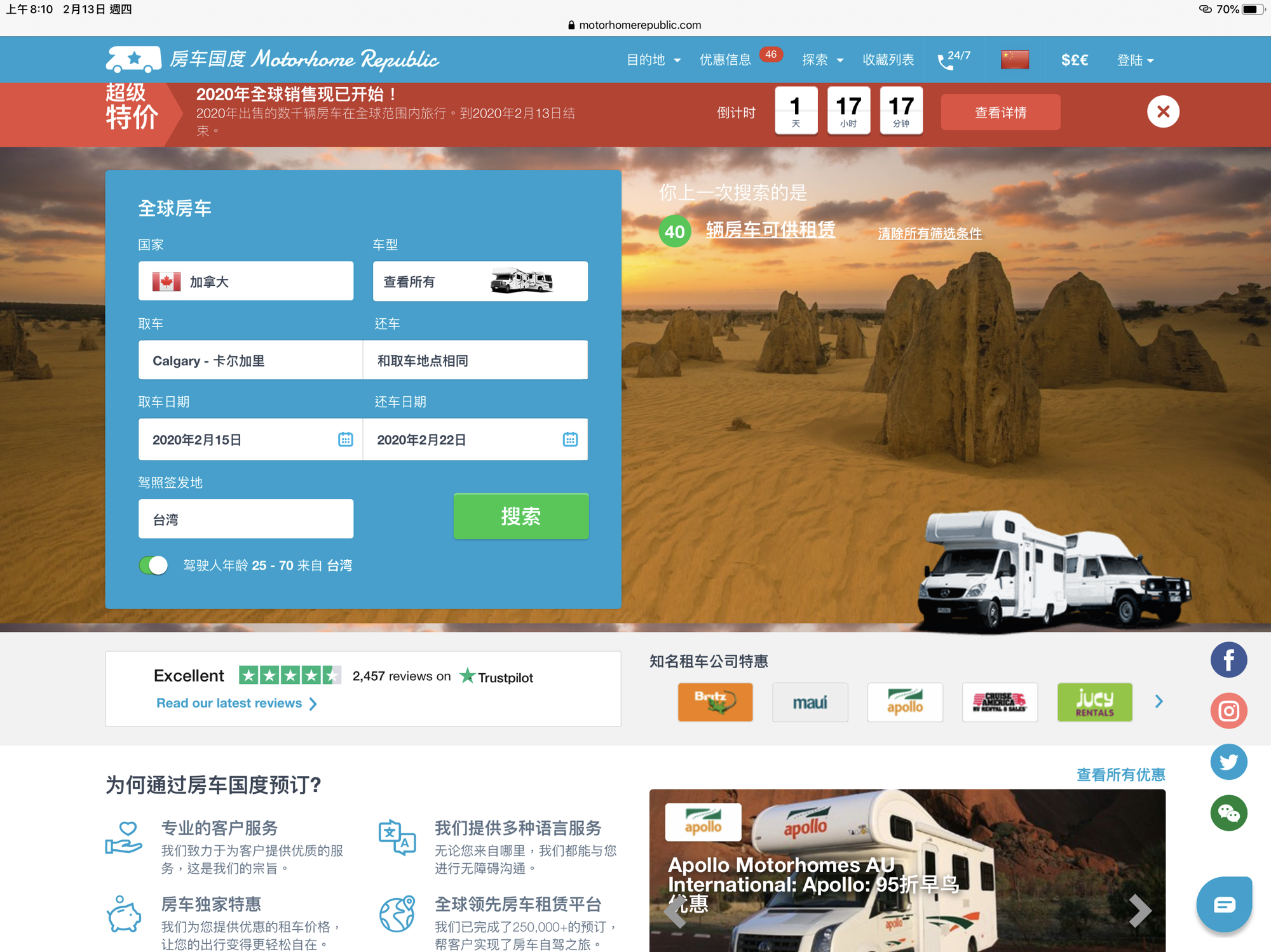從Motohome Republic等整合代銷網站開始,像訂房網站一樣容易,集合各家源頭公司,設定好條件下去搜尋便可以得到各種選擇,選好日期、刷卡下去就搞定啦! 重點是這個站有中文版!