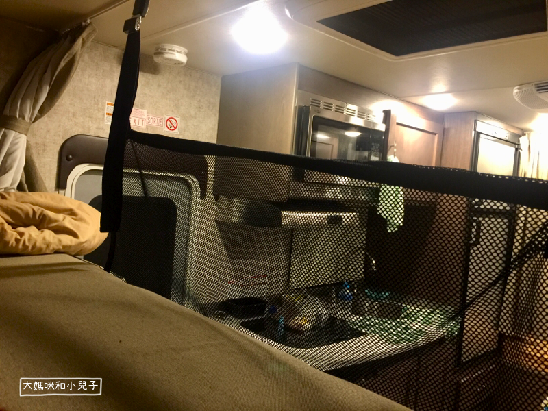 駕駛座上方的床也幾乎是標準雙人床,且是柔軟的記憶床墊,還能掛上安全網,小人睡也很OK。