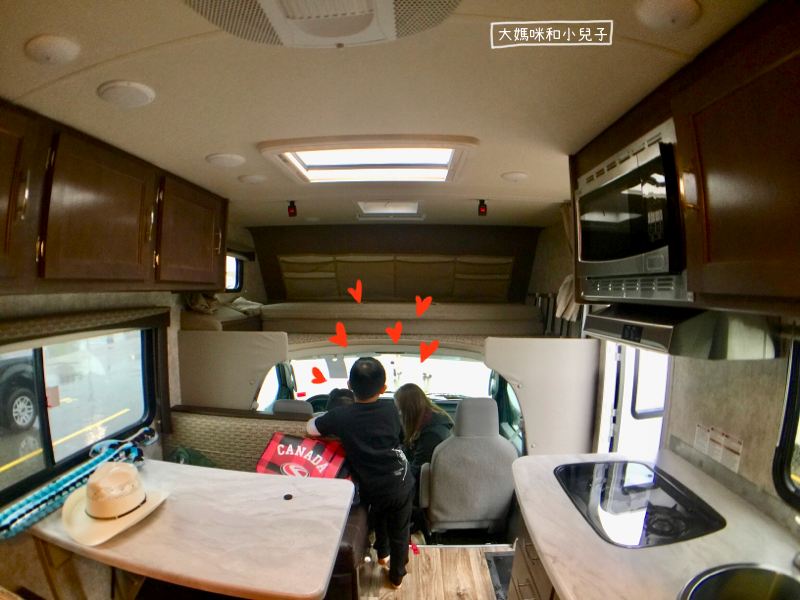 這個車款的好處就是與駕駛座相通,負責駕車的人就不會覺得很灑逼系。不過要注意的是,露營車前座的左右窗很大片,視野很好,不過如果小人坐前座就有點危險,即使繫著安全帶,感覺有可能一調皮還是會掉出去,所以最好關上窗戶,甚至就別讓小人坐前座了。