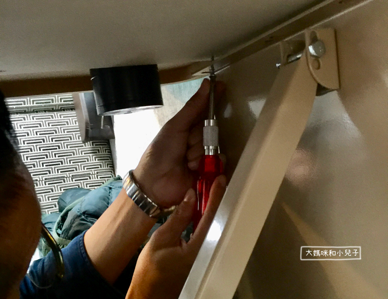 好在車上什麼工具都有,臭狗老爸只好立馬蹲下塞入小小的桌下,努力修理!所以在租車公司要盡量做好各種檢查,要住好多天的「家」,任何一項傢俱壞掉甚至受傷都會讓旅遊很敗興。