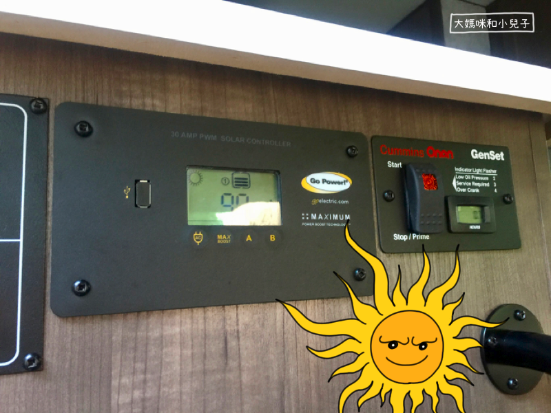 這台車上有4種發電設備:汽車電瓶、太陽能版、發電機、瓦斯(propane),所有的照明等基本用電,靠前2種都能搞定,比較特殊的有: