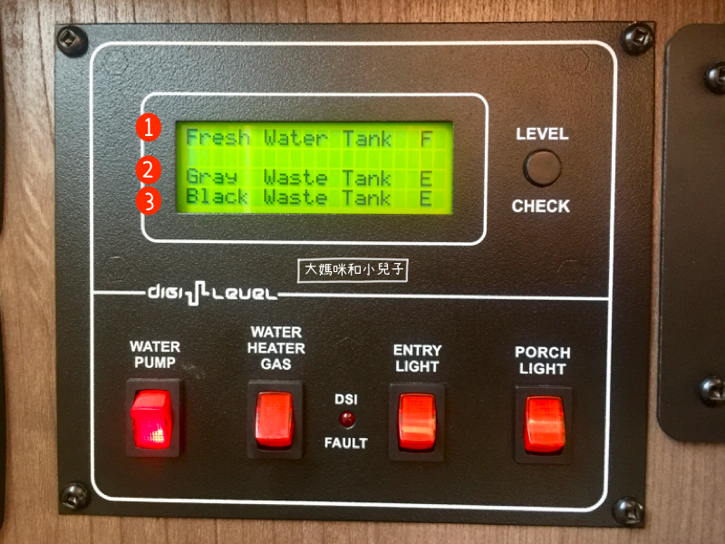1. 加滿水Fresh Wate出營地後,煮簡易中餐+洗碗,大概會用掉接近1/3(Gray Water長1/3)