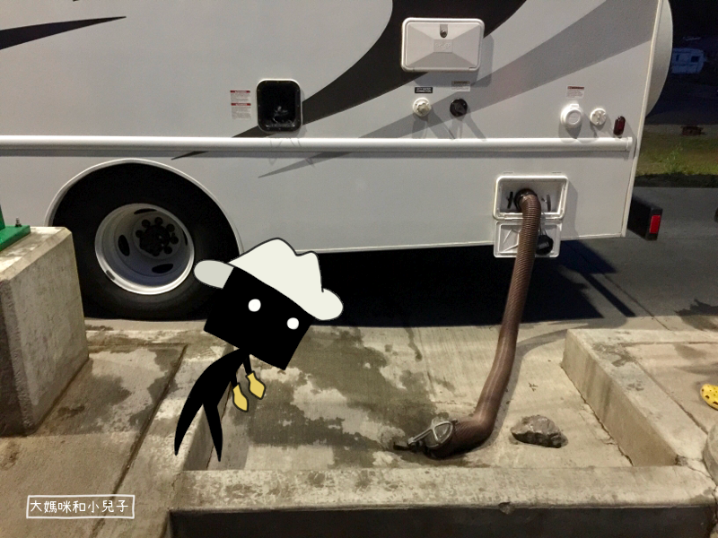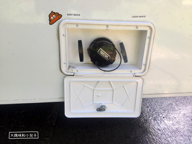 我們家實施懶人大法,所以都是在每天早上離開營地時去換水,人不多,安安靜靜地,先用清爽的雙手,開始加清水,然後轉開並接好Gray Water排水,最後戴上露營車上的清潔手套,開始排放Black Water,因為在馬桶裡有丟化學劑,所以幾乎沒什麼臭味,整個換水過程,就是「看著、扶著」等囉!