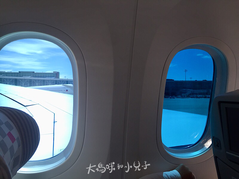 順利登機後,基本那些座位大、娛樂系統、置物空間、充電器等通通有就不多說了,窗戶,是這台飛機最神奇的地方,沒有傳統遮陽片,而是電子式的!下方有個按鈕可以調整(ㄝ?竟然沒拍到!)