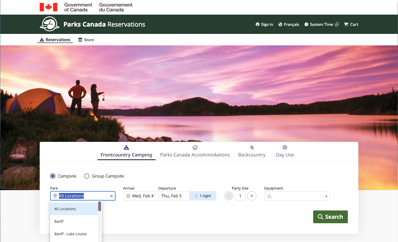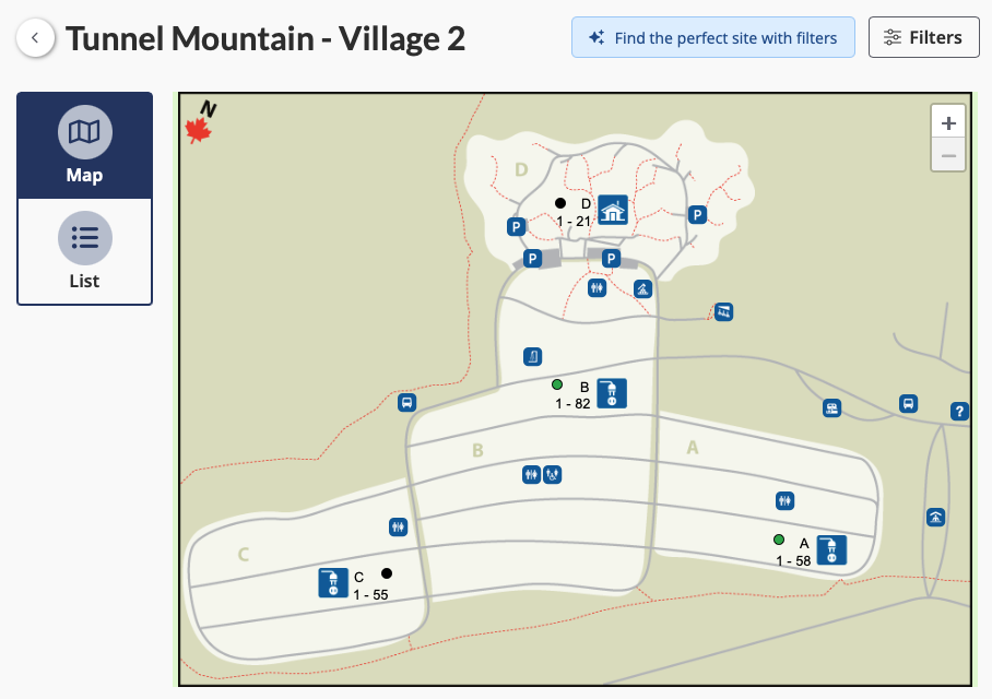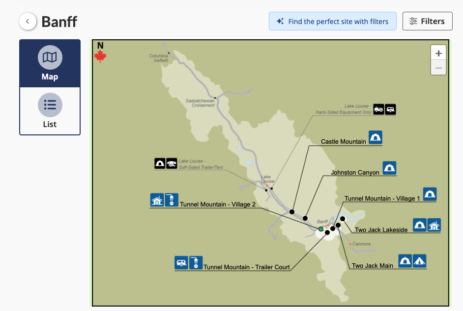 訂營地我覺得是蠻簡單的,國家公園官網很直覺 Park Canada Reservation Service,整個加拿大的國家公園都系統化管理,實在覺得很棒!總之選到Banff或想要的國家公園,點進去就能看到所有國營的營地,以下都以Banff Tunnel Mountain Village II為例。