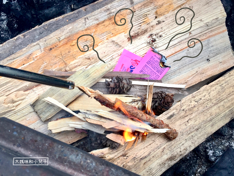 派小兒子去蒐集掉落的乾燥毬果,用樹葉、枯枝、紙,等著讓微弱的火苗逐漸燃起熊熊烈火…