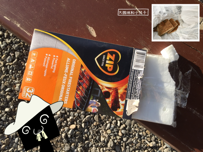 不過在超市不太好找到草片狀的,只找到這種白色充滿煤油味的化學物,也是很好燒,但就是很臭!租露營車的時候不妨到物資箱找找,像我們一樣有烤肉魂的人也可以帶一些回家。