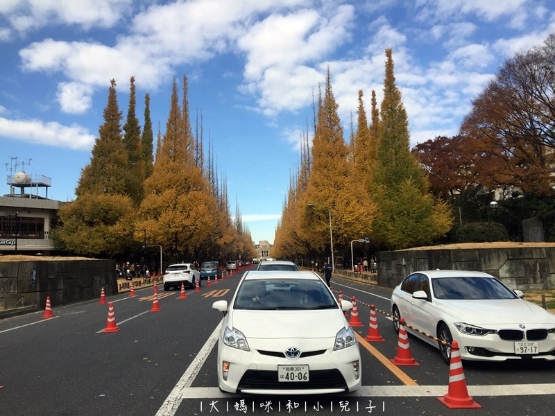 真是選對了!順著Google導航走,一路上都是體育館等文教機構,所以人潮、車潮都很少,伴隨兩旁雖小但同樣金黃的年輕銀杏,最後引薦出新宿御苑門口的超大超大株!有種在櫻花季節看到百年櫻花樹的感覺!