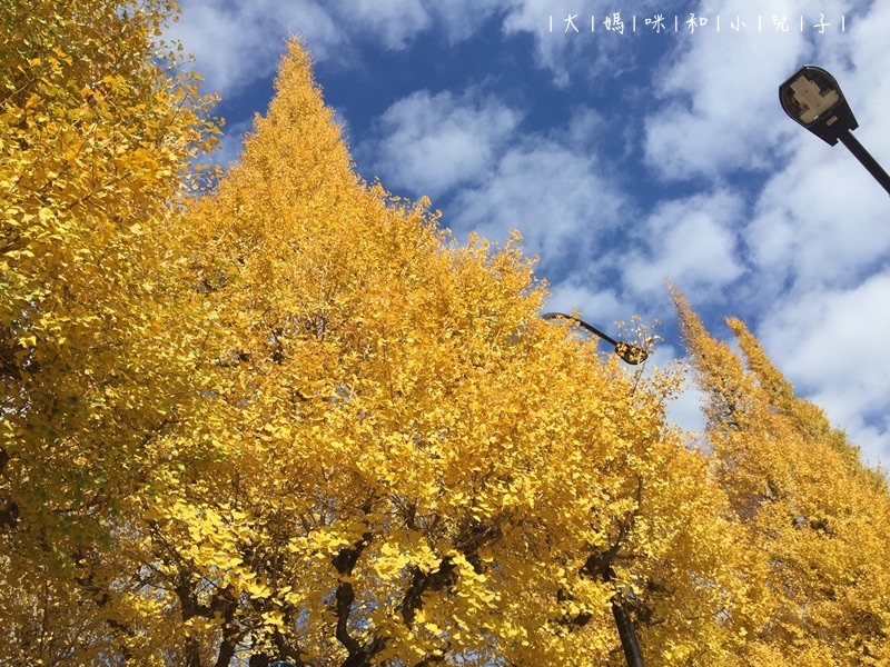 1926年種下的四排銀杏樹,快要一百歲的高大樹木們,逐漸脫光了葉子換季中,棕黑色的樹幹被金黃色及藍天襯托得各具姿態,每一株都好好看哪!