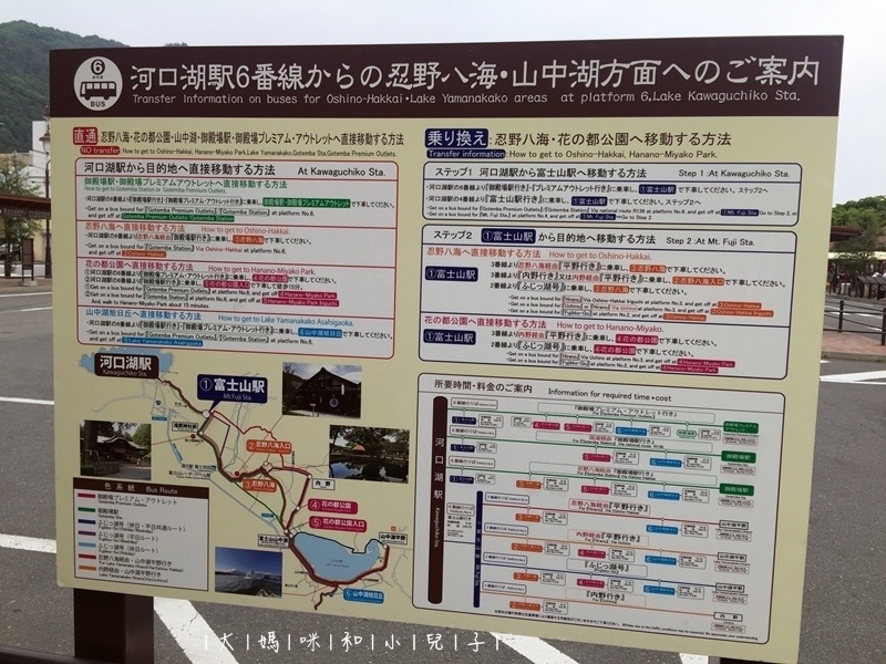 從河口湖車站往忍野八海的巴士站,在背對車站的左手邊,很容易找到,網路時刻表還算清楚準確,看這裡河口湖駅→山中湖旭日丘→御殿場駅方面,最好先查好銜接時間,車站裡的站務員有太多交通問題要回答了,雖然超親切講中文也能通,但只是領進門而已,時間的設計得考量住宿、周遊巴士等,想玩得安心,功課真的加減得做,當然歡迎參考我們的規劃。
