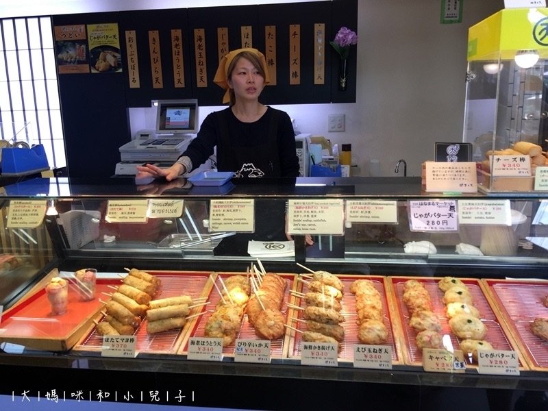 有一區很大的鐵皮屋狀角落,販賣各種熟食、特產、掛飾等,沒太多選擇,炸物頗多,怕不好吃所以只隨便買了一些,結果真是意外啊!比臺灣夜市食材品質好太多了,新鮮的魚漿包裹多種海鮮或蔬菜,點單後微波回溫,竟然依舊鮮甜不油膩!忽然覺得日本人才是真正會料理魚漿的族群哪!推薦可多買一些吃吃!