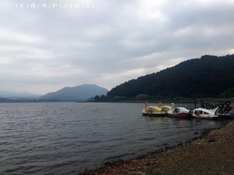 開始享受房間之前,本來預計趁天亮要到附近的「河口湖生活館」走走吃晚餐,但富士山不見了,感覺去了也不會好玩,剛剛來的路上看到天鵝船,於是改變計畫,先到附近探探路,承諾小人的踩船活動可以先達成,最好是能順路發掘適合晚餐的地方(雖然旅館哥哥說殘念並沒有所以才去超市了)。