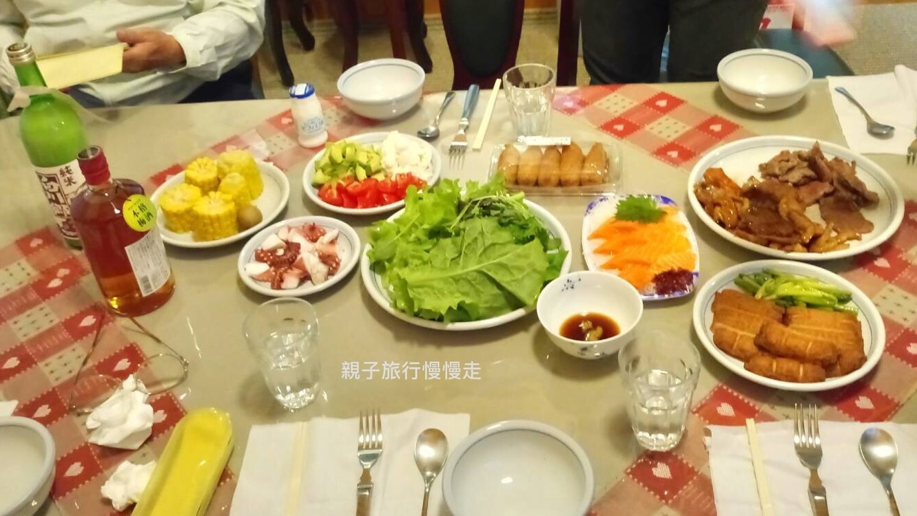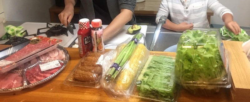 已經有點超過晚餐時間,開始準備晚餐囉!是電視裡的日式開放廚房耶!就是能面向客廳,一邊做菜一邊參予家人話題(也一邊提供油煙)的設計,我們幾乎把超市架上所有看起來高檔的肉盤通通買回來了,和牛、牛組合、黑毛豬組合,好肉肉煎一煎就能好好吃,再來兩罐現成名家醬汁調味一下,絕對爽!