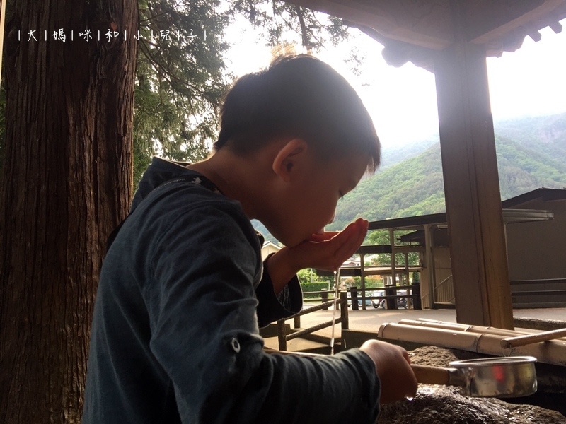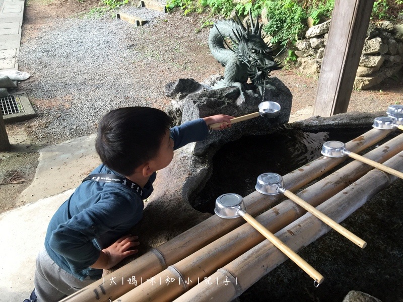 參觀神社前的第一件事,當然是洗淨身體啦!第一次體驗的小人,對冰冰涼涼的泉水最感興趣了,尤其還是從龍頭裡冒出來的,接一匙、喝一口、洗洗手,簡直是太好玩了,是說規矩是要用右手承水喝哪~左撇子馬上就全顛倒了。