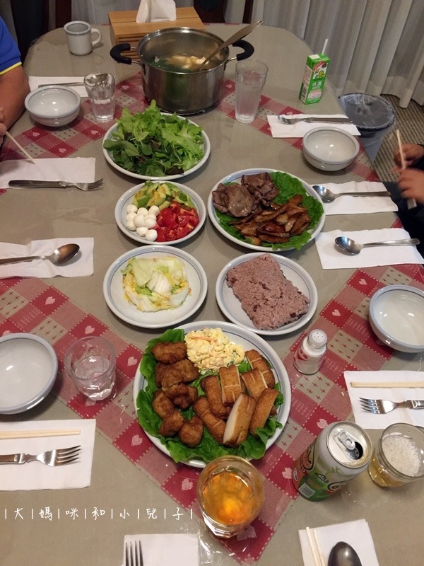 回到旅館,阿母我馬不停蹄,立刻挽起袖子做晚餐,大概是還很開心,加上料理方法單純,洗洗生菜、煎熟肉肉就好,不用一小時就合作完成一桌美味,今天可是用了和牛跟牛舌這種稀奇貨色啊!